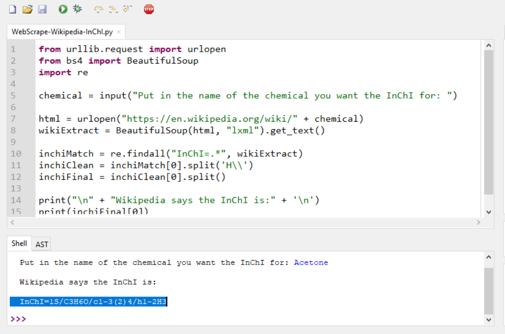 The Python File used in this tutorial can be located within the following GitHub Page along with a DOI (Digital Object Identifier) on FigShare.1 Python will run on many different operating systems, however this tutorial uses the Thonny IDE (Integrated Development Environment) to design, run and test the code.2 The following code will take a chemical name and insert this into a preformatted URL that will pull all of the html from a corresponding Wikipedia page. The code will then parse and separate out everything in the html from the InChI identifier displaying the results.